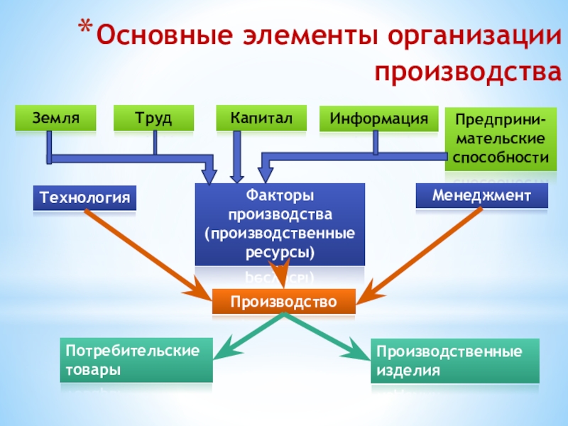 Основные элементы организации производстваЗемляТрудКапиталИнформацияПредприни-мательские способностиФакторы производства (производственные ресурсы)ТехнологияМенеджментПроизводствоПотребительские товарыПроизводственные изделия