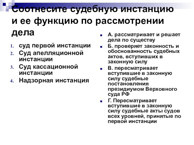 Г. Пересматривает вступившие в законную силу судебные акты судов всех уровней, принятые по первой инстанции