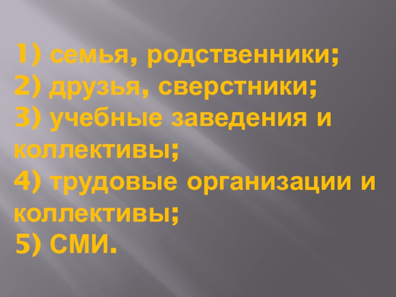 Слайд 271) семья, родственники; 2) друзья, сверстники; 3) учебные заведения и коллективы; 4) трудовые организации