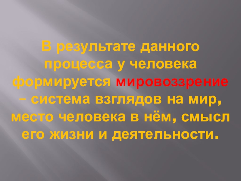 В результате данного процесса у человека формируется мировоззрение – система взглядов на мир, место человека в нём,