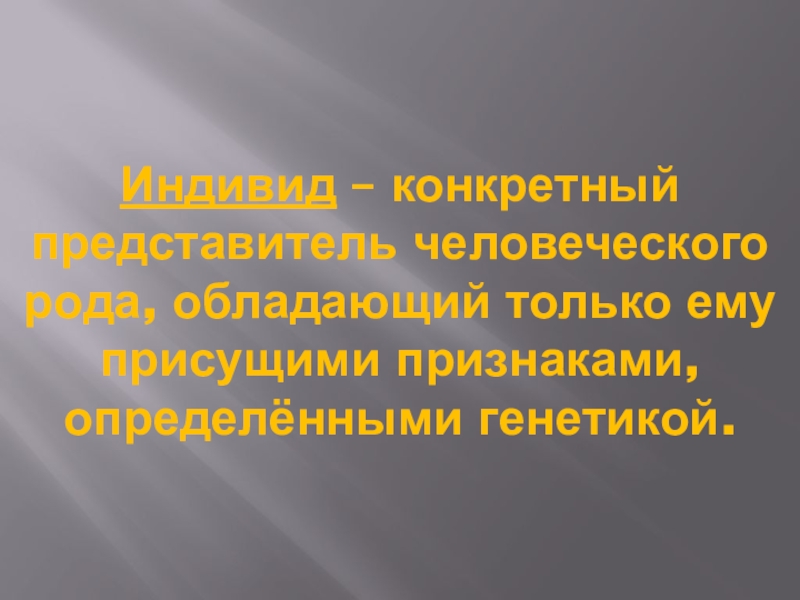 Индивид – конкретный представитель человеческого рода, обладающий только ему присущими признаками, определёнными генетикой.