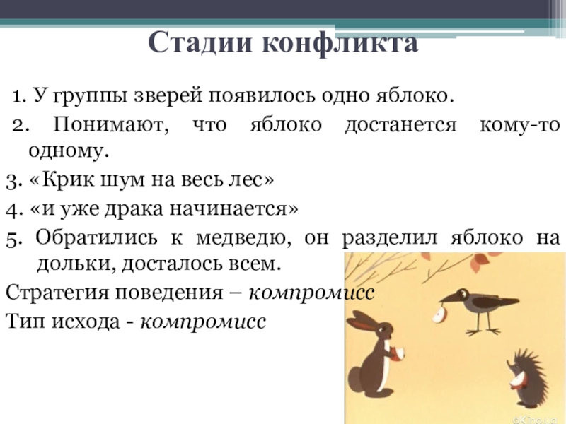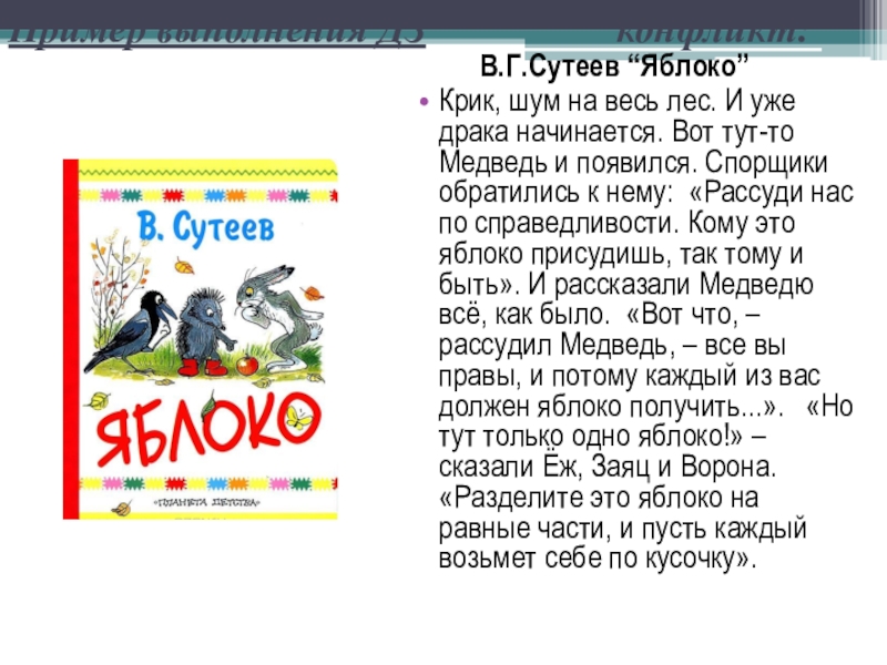 Крик, шум на весь лес. И уже драка начинается. Вот тут-то Медведь и появился. Спорщики обратились к нему: «Рассуди нас по справедливости. Кому это яблоко присудишь, так тому и быть». И рассказали Медведю всё, как было. «Вот что, – рассудил Медведь, – все вы правы, и потому каждый из вас должен яблоко получить...». «Но тут только одно яблоко!» – сказали Ёж, Заяц и Ворона. «Разделите это яблоко на равные части, и пусть каждый возьмет себе по кусочку».