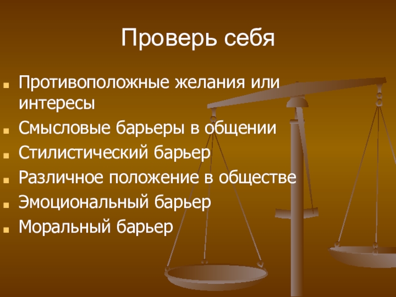 Проверь себяПротивоположные желания или интересыСмысловые барьеры в общенииСтилистический барьерРазличное положение в обществеЭмоциональный барьерМоральный барьер