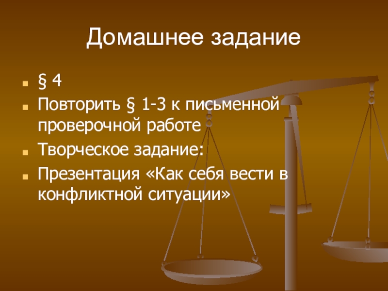 Домашнее задание§ 4 Повторить § 1-3 к письменной проверочной работеТворческое задание: Презентация «Как себя вести в конфликтной
