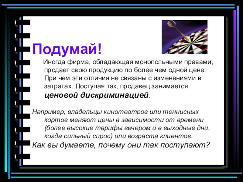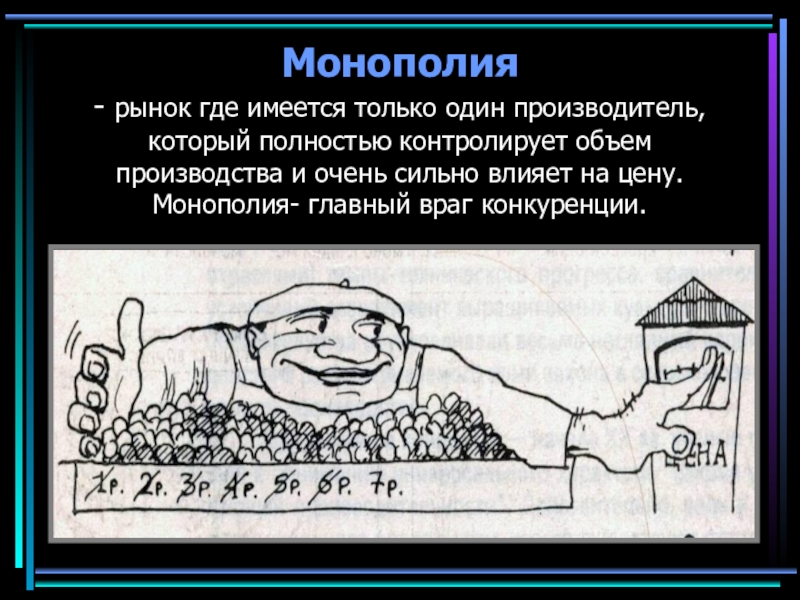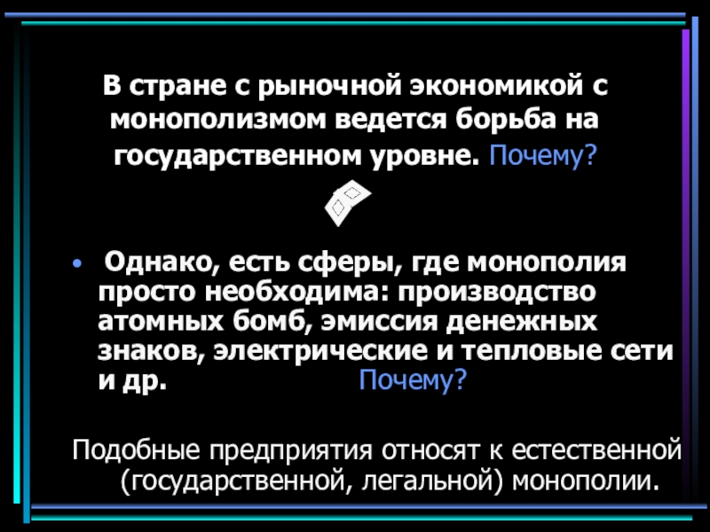 Однако, есть сферы, где монополия просто необходима: производство атомных бомб, эмиссия денежных знаков, электрические и тепловые сети и др. Почему?