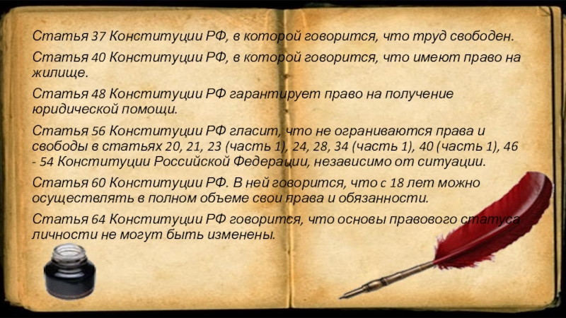 Слайд 6Статья 37 Конституции РФ, в которой говорится, что труд свободен.