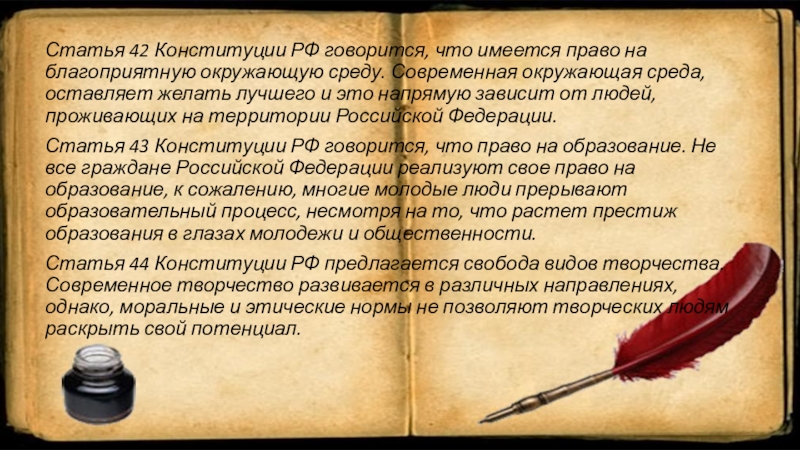 Слайд 8Статья 42 Конституции РФ говорится, что имеется право на благоприятную окружающую