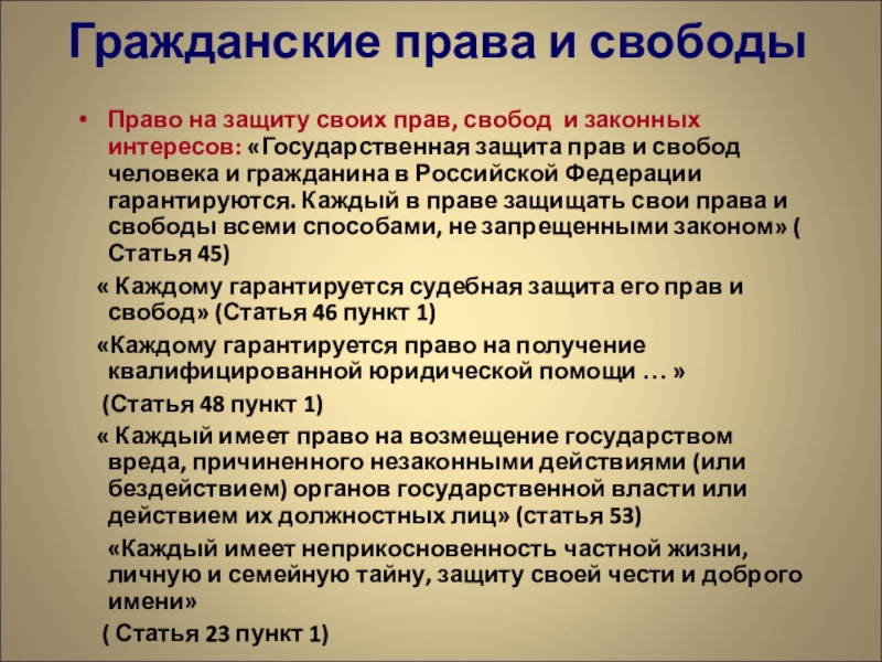 интересов: «Государственная защита прав и свобод человека и гражданина в Российской Федерации гарантируются. Каждый в праве защищать свои права и свободы всеми способами, не запрещенными законом» ( Статья 45)