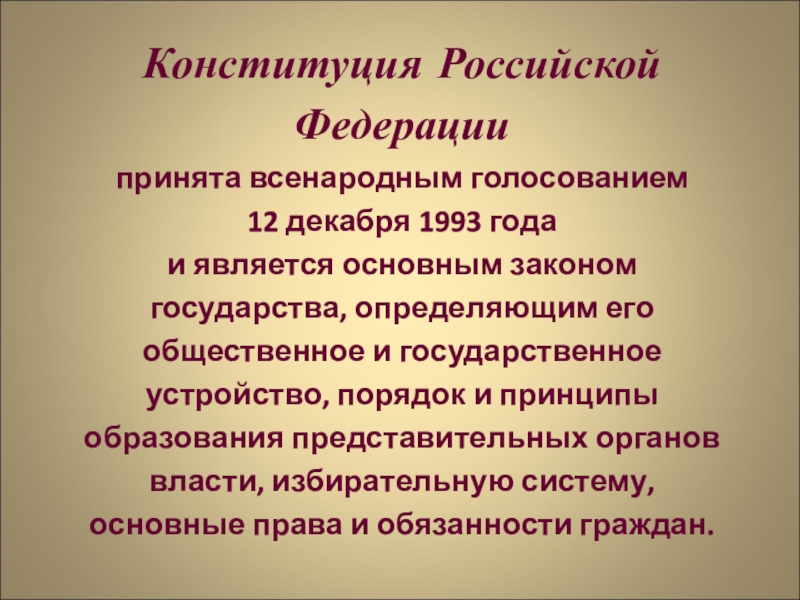 основным законом государства, определяющим его общественное и государственное устройство, порядок и принципы образования представительных органов власти, избирательную систему, основные права и обязанности граждан.
