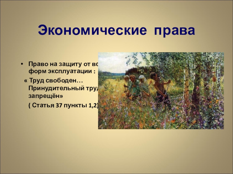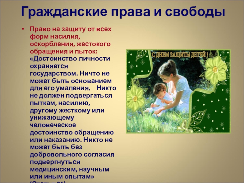 Право жить и воспитываться в семье: «Материнство и детство , семья находятся под защитой государства. Забота о детях, их воспитание – равное право и обязанность родителей» (Статья 38 пункты 1,2)