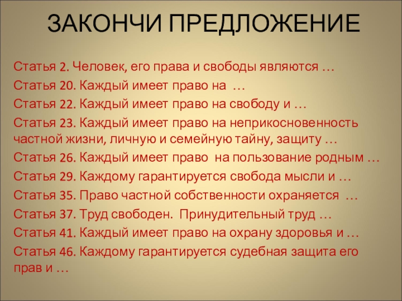 Слайд 3В Конституции РФ закреплены следующие наши права и свободы: