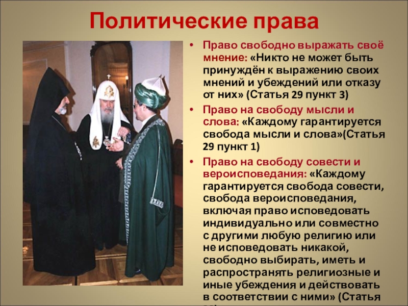 Право на свободу совести и вероисповедания: «Каждому гарантируется свобода совести, свобода вероисповедания, включая право исповедовать индивидуально или совместно с другими любую религию или не исповедовать никакой, свободно выбирать, иметь и распространять религиозные и иные убеждения и действовать в соответствии с ними» (Статья 28)