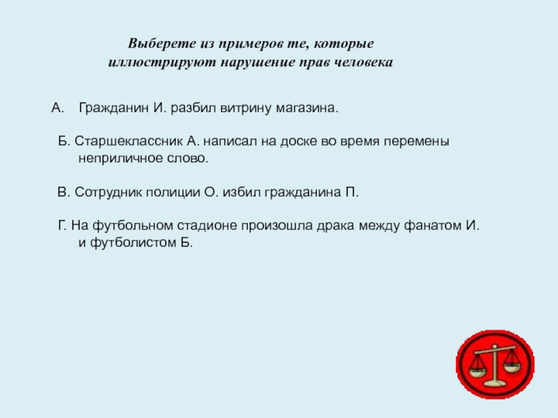 Выберете из примеров те, которые иллюстрируют нарушение прав человека