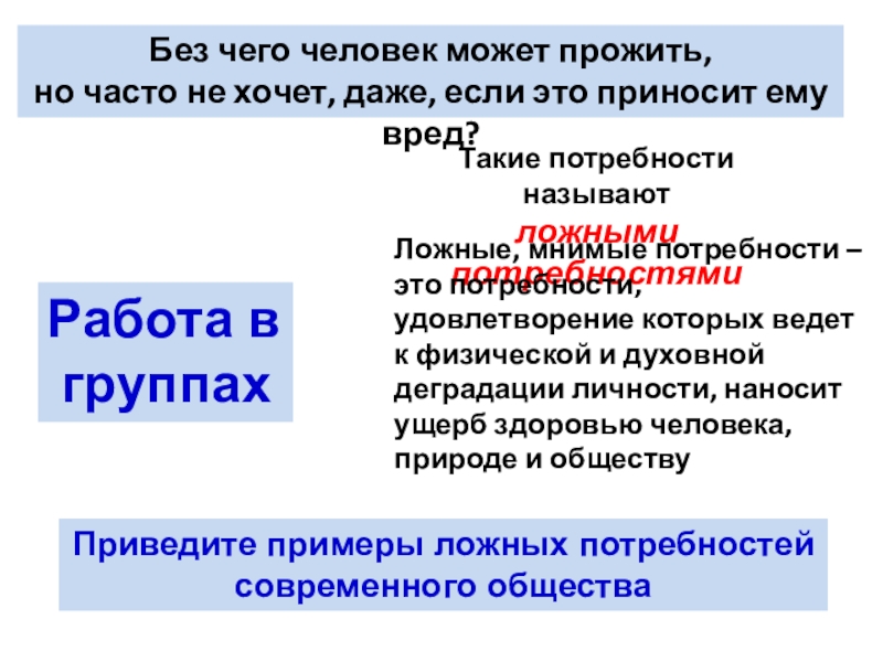 Ложные, мнимые потребности – это потребности, удовлетворение которых ведет к физической и духовной деградации личности, наносит ущерб здоровью человека, природе и обществу