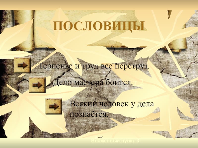 ПОСЛОВИЦЫДело мастера боится.т 2Всякий человек у дела познаётся.Вложенный пункт 3Терпенье и труд все перетрут.