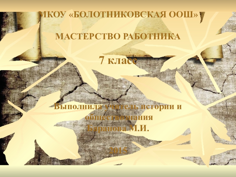 Слайд 1МКОУ «БОЛОТНИКОВСКАЯ ООШ» МАСТЕРСТВО РАБОТНИКА 7 класс Выполнила учитель истории и обществознания Баранова М.И. 2015