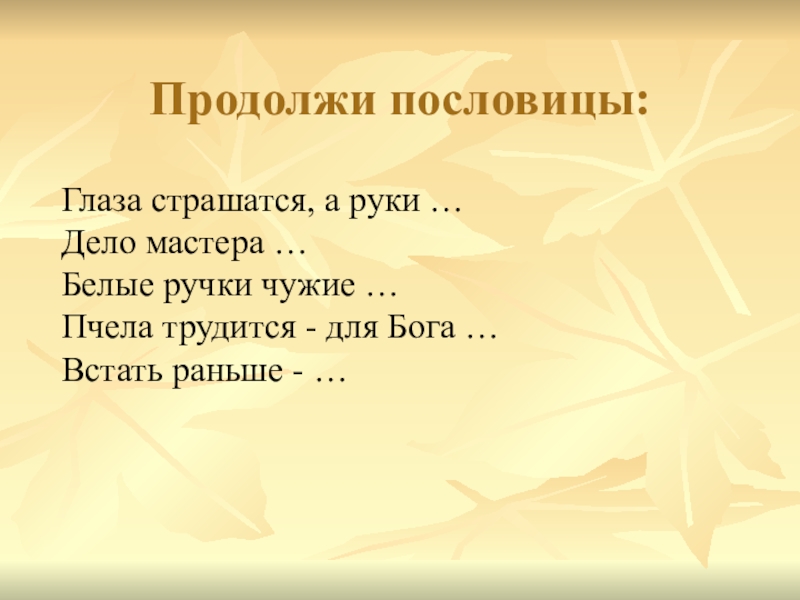 Продолжи пословицы: Глаза страшатся, а руки …Дело мастера …Белые ручки чужие …Пчела трудится - для Бога …Встать