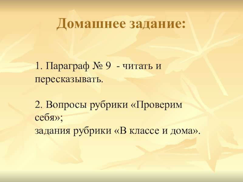 Домашнее задание:1. Параграф № 9 - читать и пересказывать.2. Вопросы рубрики «Проверим себя»; задания рубрики «В классе
