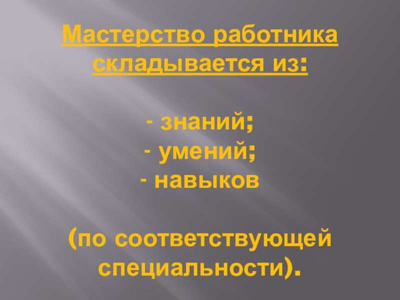 Мастерство работника складывается из:  - знаний; - умений; - навыков  (по соответствующей специальности).