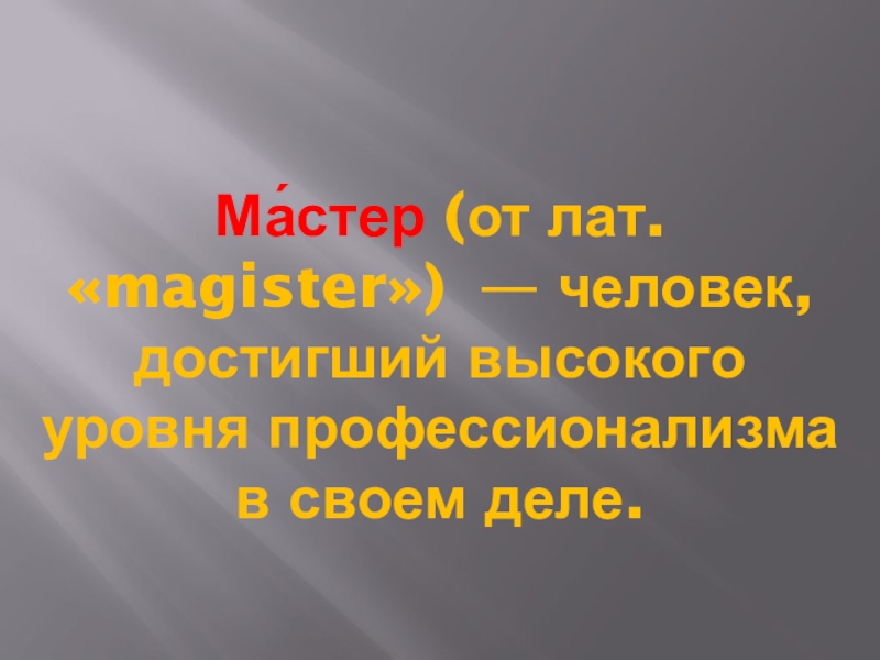 Слайд 3 Ма́стер (от лат. «magister»)  — человек, достигший высокого уровня профессионализма в своем деле.