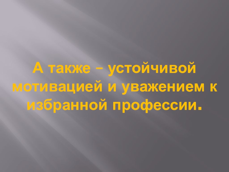 Слайд 9А также – устойчивой мотивацией и уважением к избранной профессии.