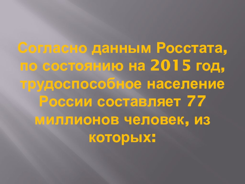 Слайд 19Согласно данным Росстата, по состоянию на 2015 год, трудоспособное население России