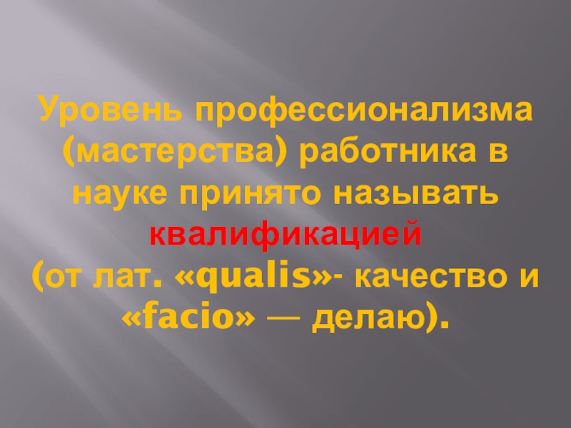 Слайд 4Уровень профессионализма (мастерства) работника в науке принято называть квалификацией (от лат.