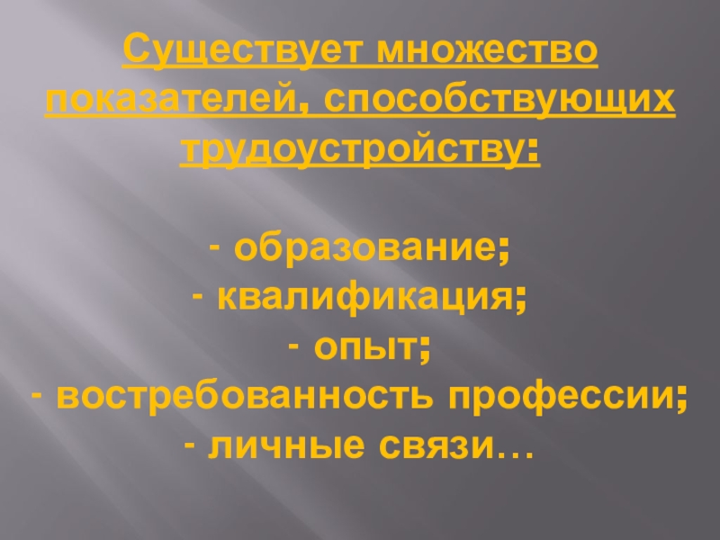 Существует множество показателей, способствующих трудоустройству:  - образование; - квалификация; - опыт; - востребованность профессии; - личные