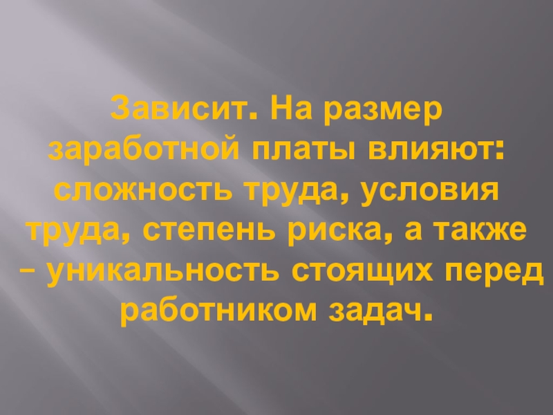 Слайд 12Зависит. На размер заработной платы влияют: сложность труда, условия труда, степень