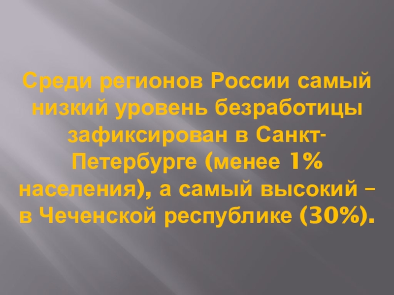 Слайд 23Среди регионов России самый низкий уровень безработицы зафиксирован в Санкт-Петербурге (менее