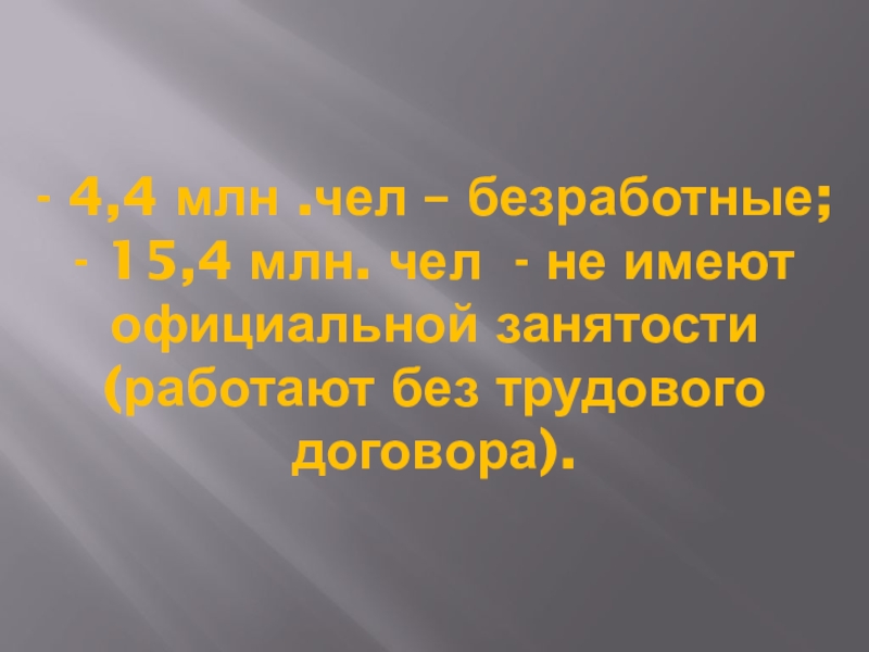 - 4,4 млн .чел – безработные; - 15,4 млн. чел - не имеют официальной занятости (работают без