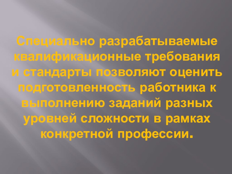 Слайд 5Специально разрабатываемые квалификационные требования и стандарты позволяют оценить подготовленность работника к