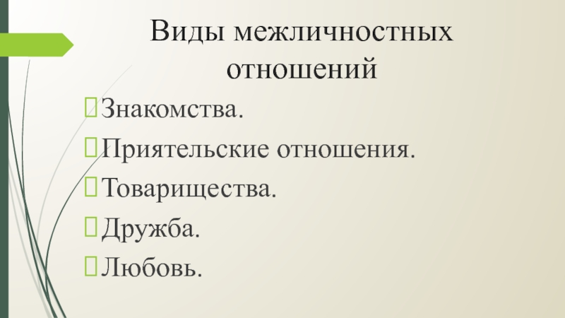 Виды межличностных отношенийЗнакомства. Приятельские отношения. Товарищества.Дружба. Любовь.