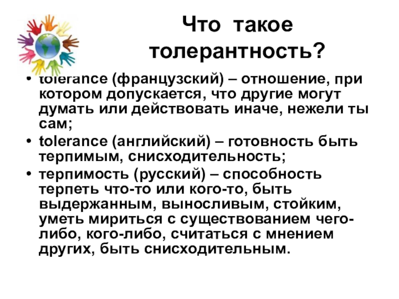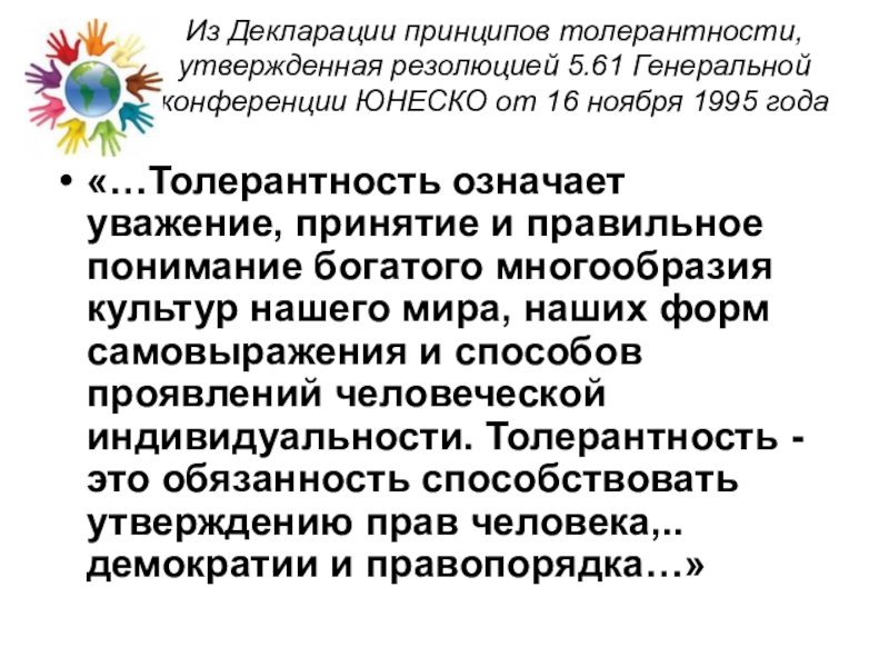 «…Толерантность означает уважение, принятие и правильное понимание богатого многообразия культур нашего мира, наших форм самовыражения и способов проявлений человеческой индивидуальности. Толерантность - это обязанность способствовать утверждению прав человека,.. демократии и правопорядка…»
