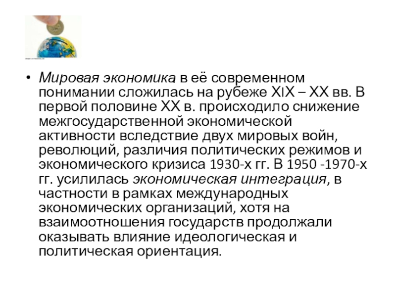 ХХ вв. В первой половине ХХ в. происходило снижение межгосударственной экономической активности вследствие двух мировых войн, революций, различия политических режимов и экономического кризиса 1930-х гг. В 1950 -1970-х гг. усилилась экономическая интеграция, в частности в рамках международных экономических организаций, хотя на взаимоотношения государств продолжали оказывать влияние идеологическая и политическая ориентация.