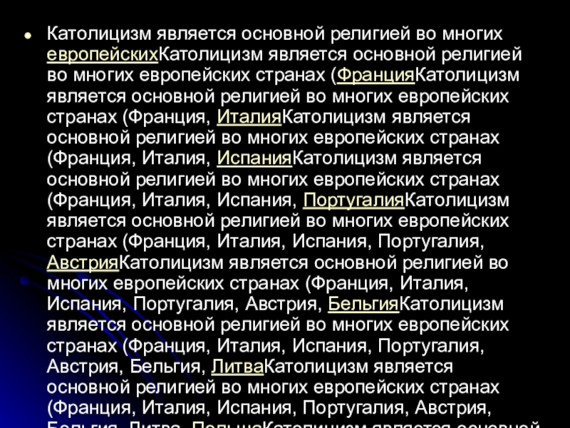 многих европейских странах (ФранцияКатолицизм является основной религией во многих европейских странах (Франция, ИталияКатолицизм является основной религией во многих европейских странах (Франция, Италия, ИспанияКатолицизм является основной религией во многих европейских странах (Франция, Италия, Испания, ПортугалияКатолицизм является основной религией во многих европейских странах (Франция, Италия, Испания, Португалия, АвстрияКатолицизм является основной религией во многих европейских странах (Франция, Италия, Испания, Португалия, Австрия, БельгияКатолицизм является основной религией во многих европейских странах (Франция, Италия, Испания, Португалия, Австрия, Бельгия, ЛитваКатолицизм является основной религией во многих европейских странах (Франция, Италия, Испания, Португалия, Австрия, Бельгия, Литва, ПольшаКатолицизм является основной религией во многих европейских странах (Франция, Италия, Испания, Португалия, Австрия, Бельгия, Литва, Польша, ЧехияКатолицизм является основной религией во многих европейских странах (Франция, Италия, Испания, Португалия, Австрия, Бельгия, Литва, Польша, Чехия, ВенгрияКатолицизм является основной религией во многих европейских странах (Франция, Италия, Испания, Португалия, Австрия, Бельгия, Литва, Польша, Чехия, Венгрия, СловакияКатолицизм является основной религией во многих европейских странах (Франция, Италия, Испания, Португалия, Австрия, Бельгия, Литва, Польша, Чехия, Венгрия, Словакия, СловенияКатолицизм является основной религией во многих европейских странах (Франция, Италия, Испания, Португалия, Австрия, Бельгия, Литва, Польша, Чехия, Венгрия, Словакия, Словения, ХорватияКатолицизм является основной религией во многих европейских странах (Франция, Италия, Испания, Португалия, Австрия, Бельгия, Литва, Польша, Чехия, Венгрия, Словакия, Словения, Хорватия, ИрландияКатолицизм является основной религией во многих европейских странах (Франция, Италия, Испания, Португалия, Австрия, Бельгия, Литва, Польша, Чехия, Венгрия, Словакия, Словения, Хорватия, Ирландия, МальтаКатолицизм является основной религией во многих европейских странах (Франция, Италия, Испания, Португалия, Австрия, Бельгия, Литва, Польша, Чехия, Венгрия, Словакия, Словения, Хорватия, Ирландия, Мальта и др.). Всего в 21 государстве Европы католики составляют большинство населения, в ГерманииКатолицизм является основной религией во многих европейских странах (Франция, Италия, Испания, Португалия, Австрия, Бельгия, Литва, Польша, Чехия, Венгрия, Словакия, Словения, Хорватия, Ирландия, Мальта и др.). Всего в 21 государстве Европы католики составляют большинство населения, в Германии, НидерландахКатолицизм является основной религией во многих европейских странах (Франция, Италия, Испания, Португалия, Австрия, Бельгия, Литва, Польша, Чехия, Венгрия, Словакия, Словения, Хорватия, Ирландия, Мальта и др.). Всего в 21 государстве Европы католики составляют большинство населения, в Германии, Нидерландах и Швейцарии — половину.