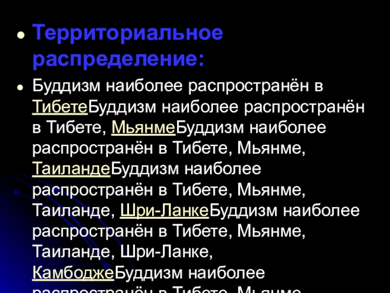 Буддизм наиболее распространён в ТибетеБуддизм наиболее распространён в Тибете, МьянмеБуддизм