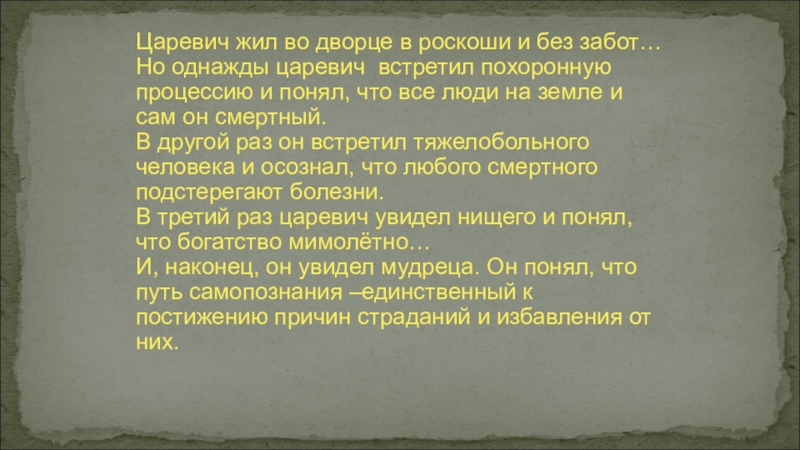 И, наконец, он увидел мудреца. Он понял, что путь самопознания –единственный к постижению причин страданий и избавления от них.