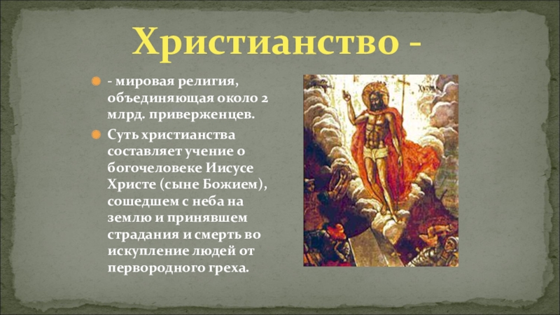христианства составляет учение о богочеловеке Иисусе Христе (сыне Божием), сошедшем с неба на землю и принявшем страдания и смерть во искупление людей от первородного греха.