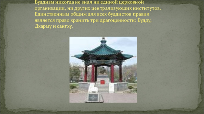 Слайд 32Буддизм никогда не знал ни единой церковной организации, ни других централизующих