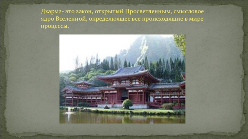 Слайд 28Дхарма- это закон, открытый Просветленным, смысловое ядро Вселенной, определюящее все происходящие