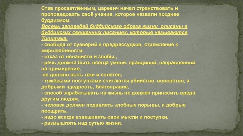 Слайд 27Став просветлённым, царевич начал странствовать и проповедовать своё учение, которое назвали