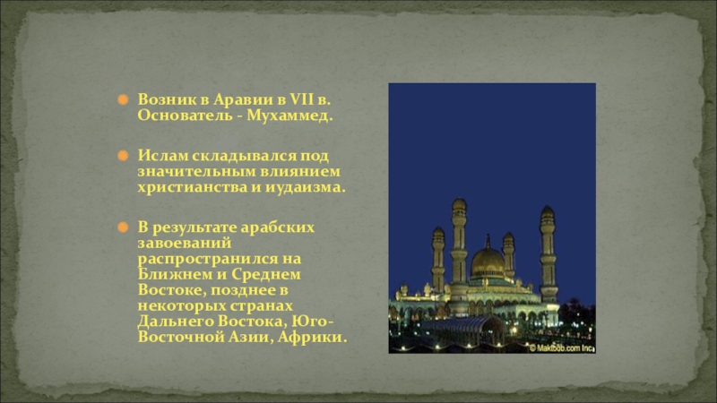 Слайд 45Возник в Аравии в VII в. Основатель - Мухаммед.