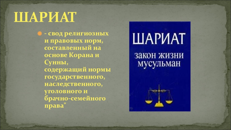 - свод религиозных и правовых норм, составленный на основе Корана и