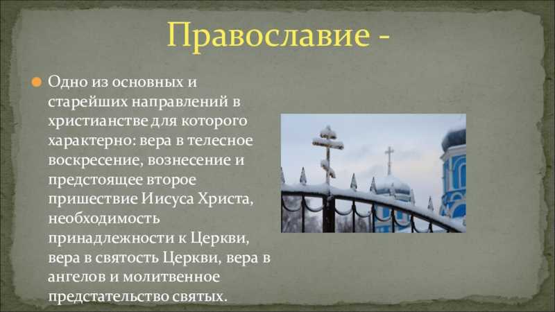которого характерно: вера в телесное воскресение, вознесение и предстоящее второе пришествие Иисуса Христа, необходимость принадлежности к Церкви, вера в святость Церкви, вера в ангелов и молитвенное предстательство святых.