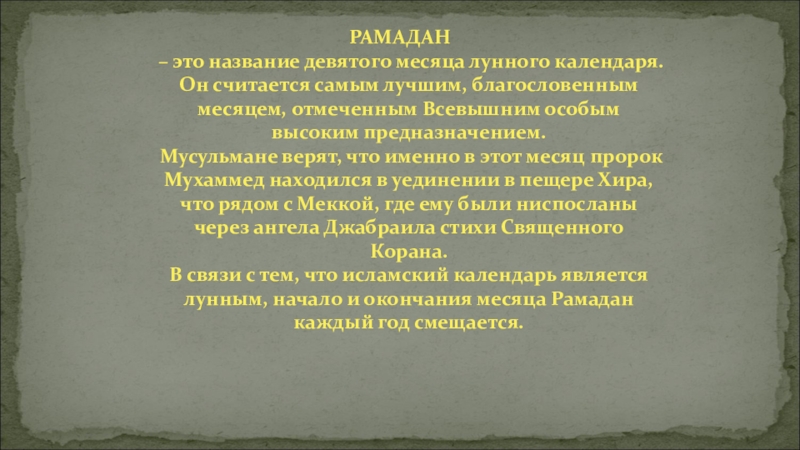 Мусульмане верят, что именно в этот месяц пророк Мухаммед находился в уединении в пещере Хира, что рядом с Меккой, где ему были ниспосланы через ангела Джабраила стихи Священного Корана.