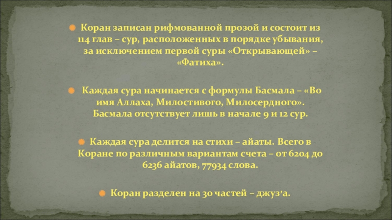Слайд 49Коран записан рифмованной прозой и состоит из 114 глав – сур,