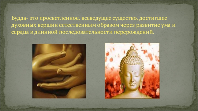 Слайд 33Будда- это просветленное, всеведущее существо, достигшее духовных вершин естественным образом через