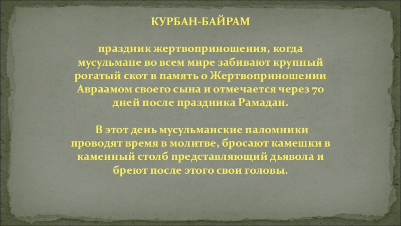 скот в память о Жертвоприношении Авраамом своего сына и отмечается через 70 дней после праздника Рамадан.