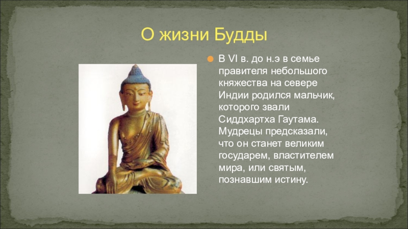 княжества на севере Индии родился мальчик, которого звали Сиддхартха Гаутама. Мудрецы предсказали, что он станет великим государем, властителем мира, или святым, познавшим истину.